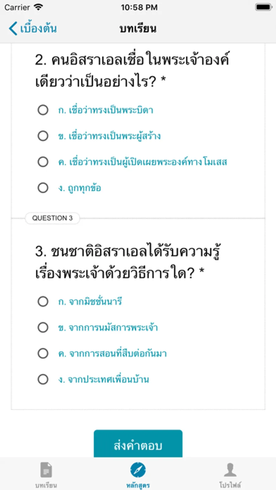 - แต่ละบทมี 7 คำถาม ตอบถูก 4 คำถามขึ้นไปถือว่าผ่าน