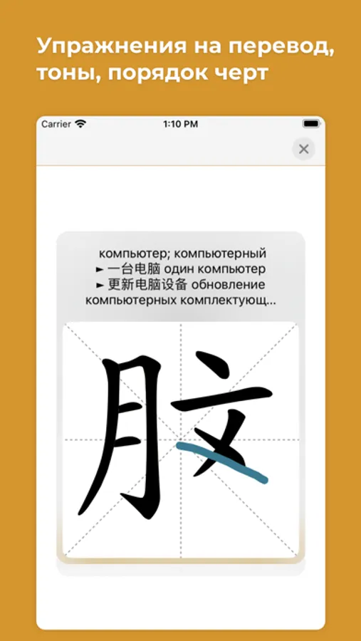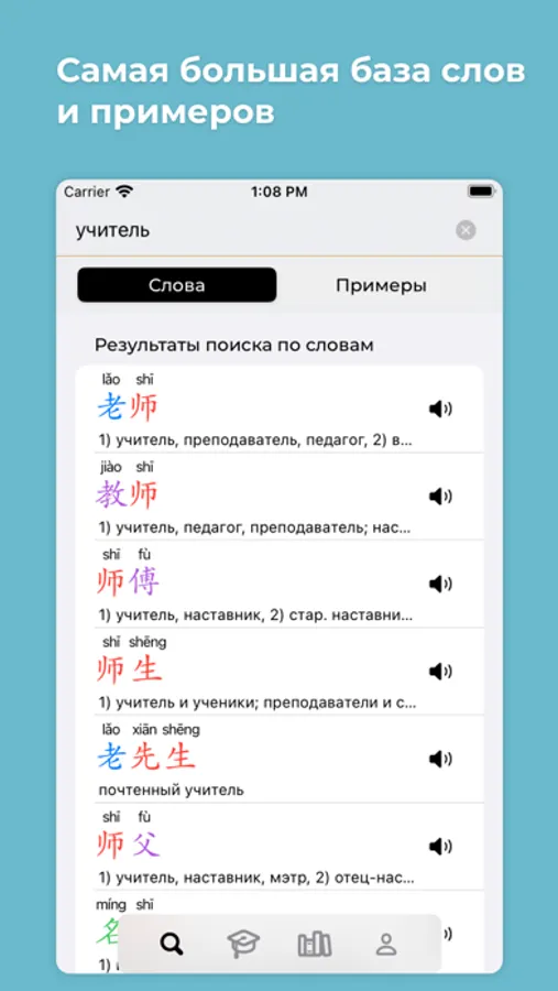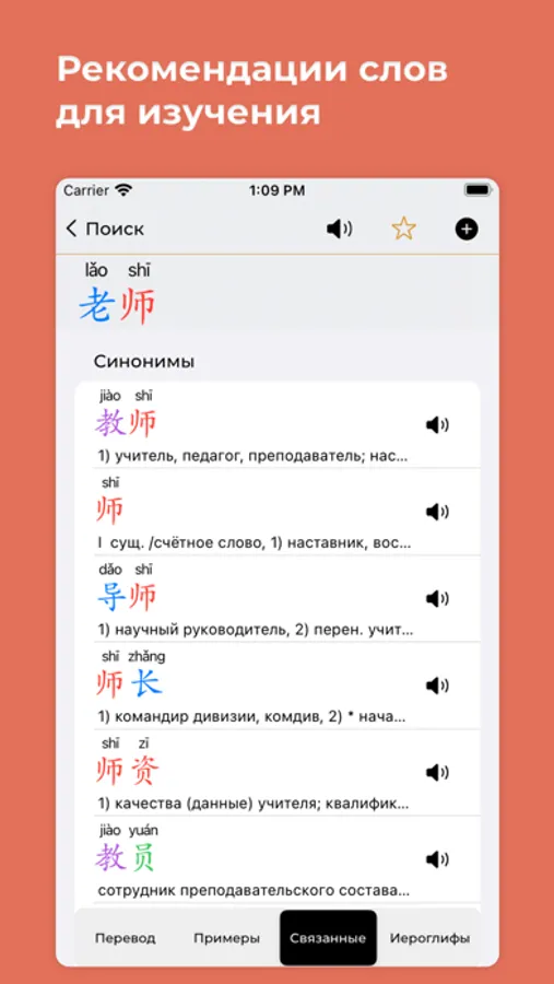 - Поиск по пиньинь, иероглифам, русскому переводу с разложением предложений на слова;