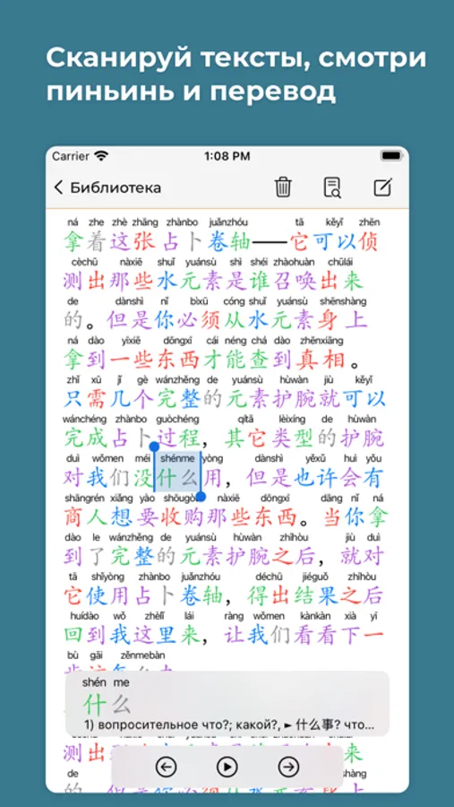 - Сканирование текстов, можно смотреть пиньинь и перевод слов;