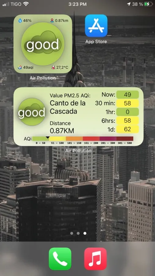 The App has a Today's Extension aka Widget, for you to see the AQI values (a standardized number to measure pollutant contaminants) and shows the color table and a description depending on the risk level.