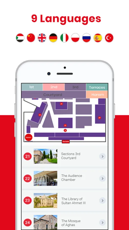 With this audio app you will listen to the most important information about the long history of the Topkapi Palace. The pictures on your screen will help you to recognize the points of information. You can play and listen to each recording at exact points or any other time you want.nn In total there are 64 highlights at 59 points with a total audio time of around 50 minutes.