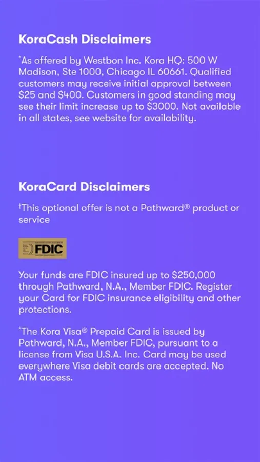 Kora Visa® Prepaid Card is issued by Pathward, N.A., Member FDIC, pursuant to a license from Visa U.S.A. Inc. Card can be used everywhere Visa debit cards are accepted. No Cash Access.