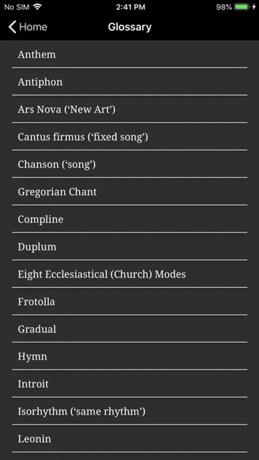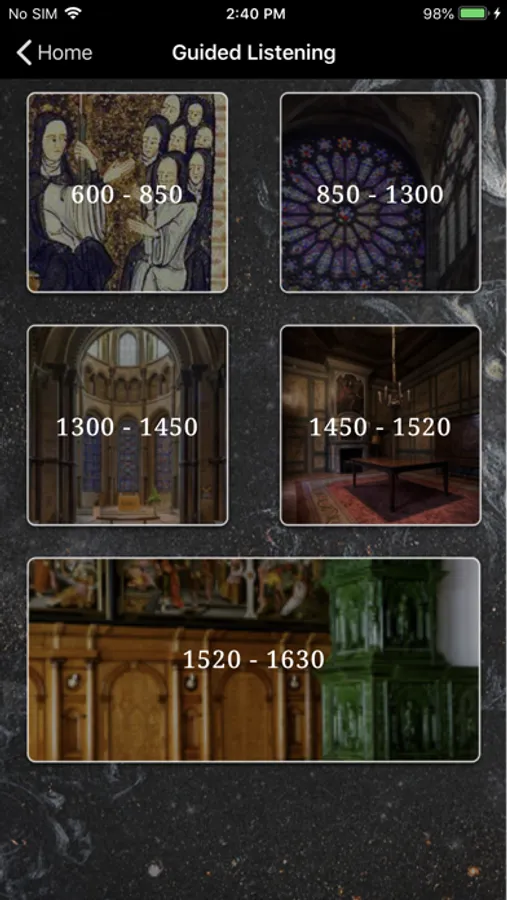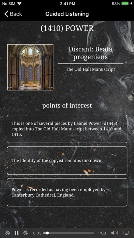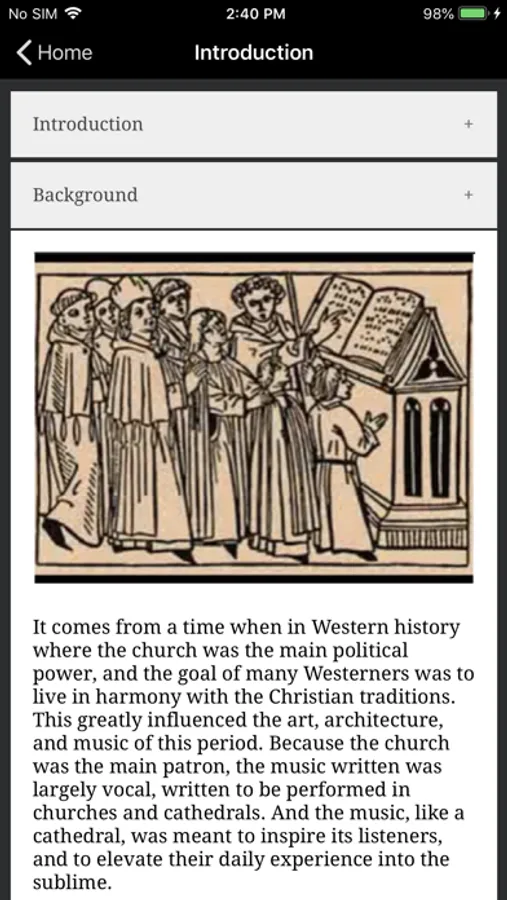 Most people are very familiar with Western classical music from roughly 1650 to 1900, or ‘tonal’ music. This app is intended to give you a glimpse into the rich repertoire of Western music written before the 17th century, or ‘modal’ music, so that you may better appreciate and enjoy this repertoire. Although there is some text to guide you through it, the app is intended primarily to heighten your enjoyment of this music, more so than to formally study it. We hope you can learn to enjoy it as much as the authors do.