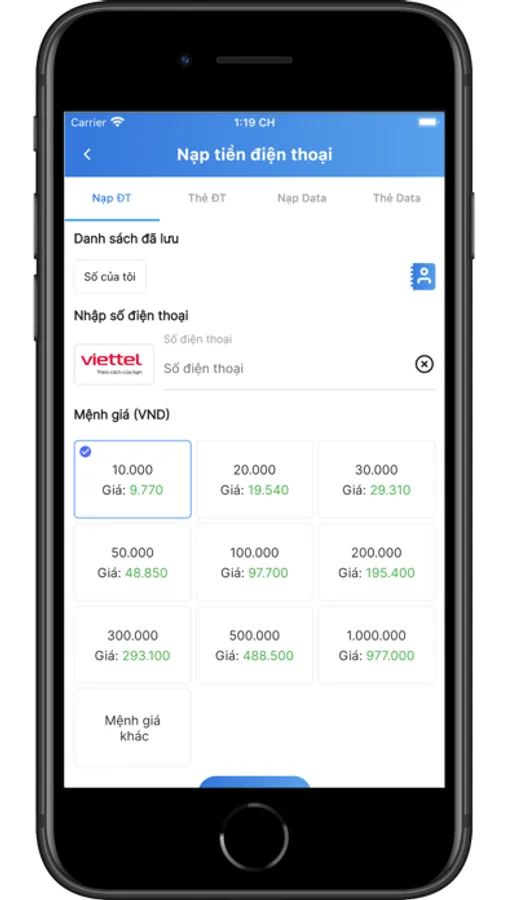 - Nạp tiền và mua thẻ điện thoại của tất cả nhà mạng trên toàn quốc: Viettel, Mobifone, Vinaphone, Vietnamobile, Gmobile. Với các ưu đãi đặc biệt và hấp dẫn.
