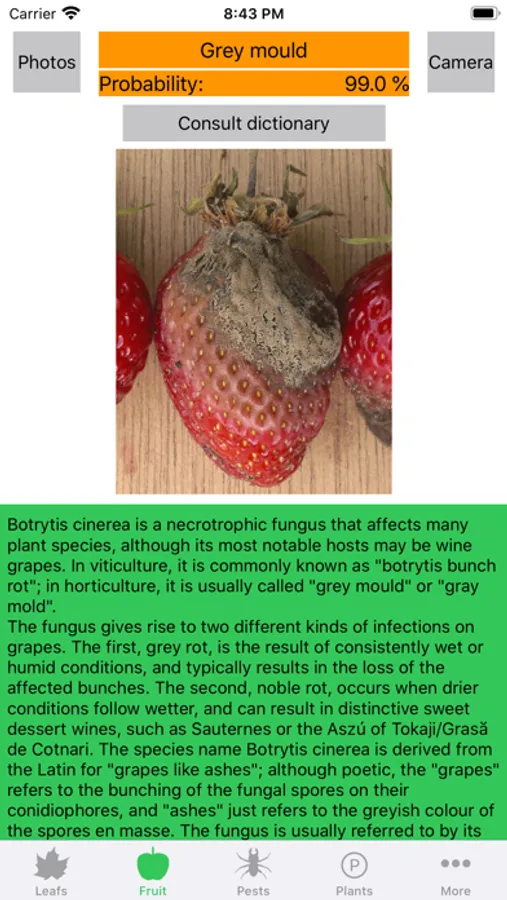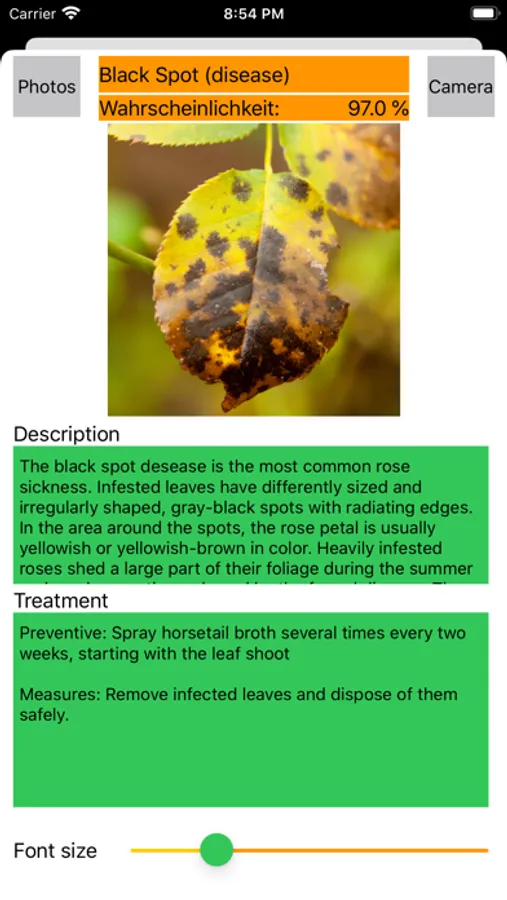 Take or load a photo of the infested leaf, fruit or of the insect and the app will detect the plant disease respectively the pest. It will then load the description and image from the identified disease or pest so that you check if the result is correct. It will also provide suggestions for preventing and treating the disease or controlling the pest.
