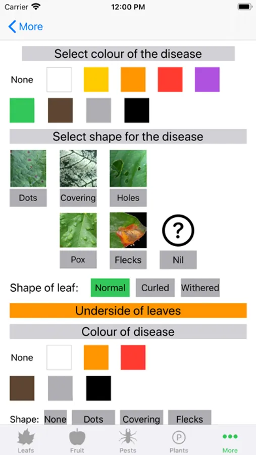 As an additional help you can use our check list that filters diseases by color and shape. Just push the buttons for color and shape and the system will provide you with a list of possible diseases. You can also filter insects by by category and color.