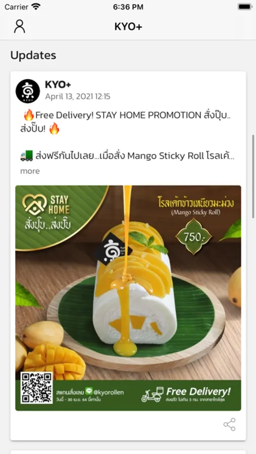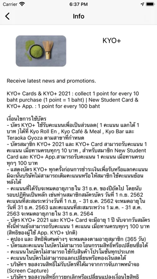 Kyo+ บัตรสมาชิกบนแอปรูปแบบใหม่ ที่ให้คุณใช้สะสมคะแนนเพื่อใช้แทนเงินสดได้เต็มมูลค่า 1 คะแนนเท่ากับ 1 บาท พร้อมรับคูปองส่วนลด และสิทธิพิเศษมากมาย เอกสิทธิ์เฉพาะคุณ ที่ Kyo Roll En ทุกสาขา และแบรนด์ในเครือ อาทิ Sfree และ Teraoka Gyoza