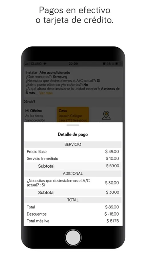 Además la app te ofrece la posibilidad de comprar todos los repuestos, materiales o insumos del servicio que se necesiten y garantizados, sin necesidad de ir a la tienda y perder tiempo.