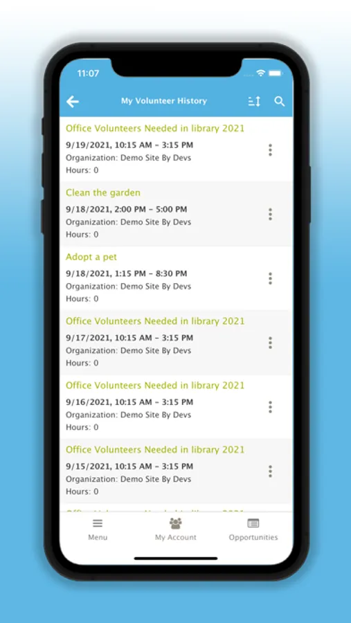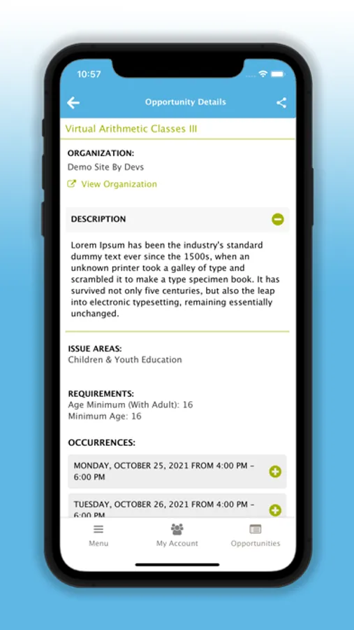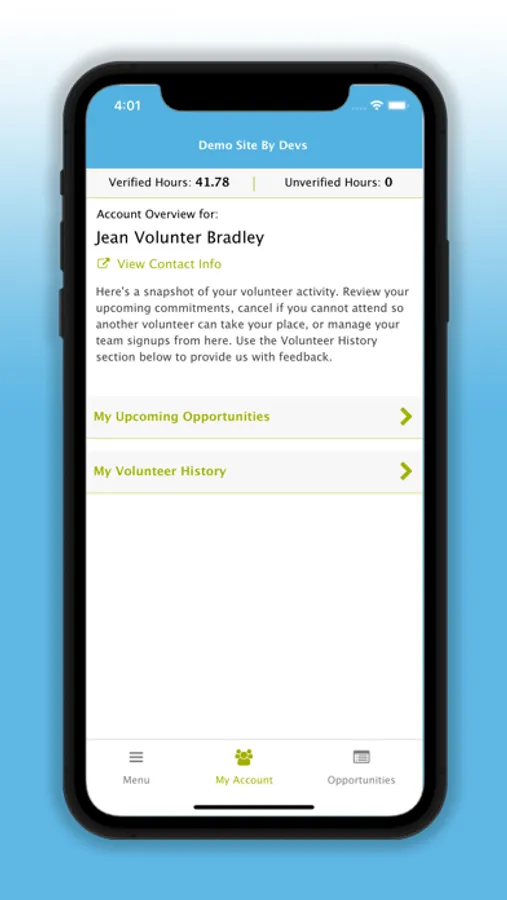The HandsOn Connect App allows you to log into your existing account for any volunteer website powered by HandsOn Connect and search and sign-up for selected Volunteer Opportunities. You can view and manage your existing signups, add your upcoming connections to your calendar, and view your volunteer history.