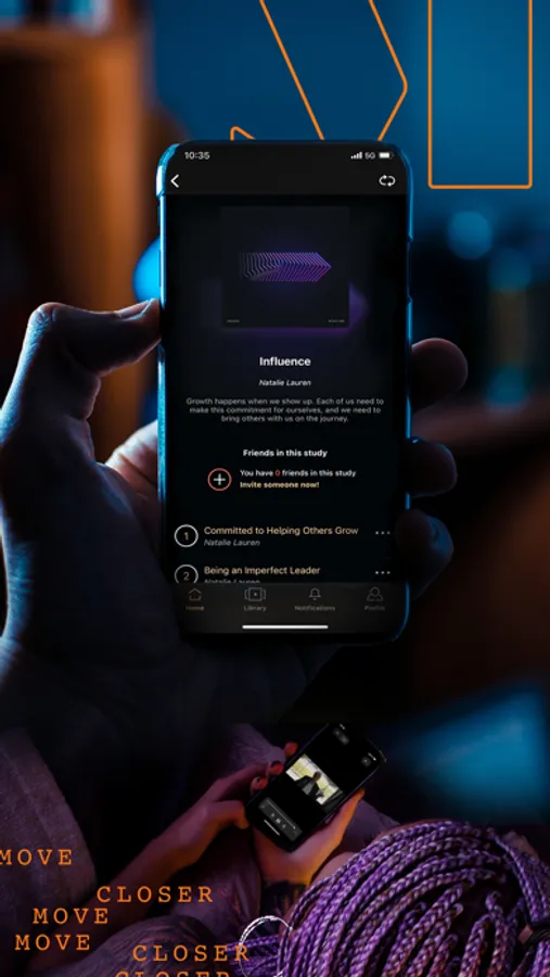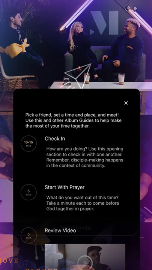 Topics on Move Closer are broken into albums. Each album features five tracks, including Scripture, devotional content, and discussion questions. Each album includes a meetup guide to help guide a weekly meeting with friends. Complete albums with friends and then select another album or replay with new friends! Connect with your church or ministry to immediately access a list of users from your church on the app. All of this is done to help you move closer to God and friends as you follow Jesus together.