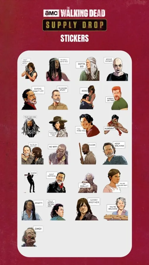 AMC’s The Walking Dead Supply Drop official sticker pack includes iconic characters and walkers from the TV series like Rick, Daryl, Michonne, Alpha, Carol, Negan and more.