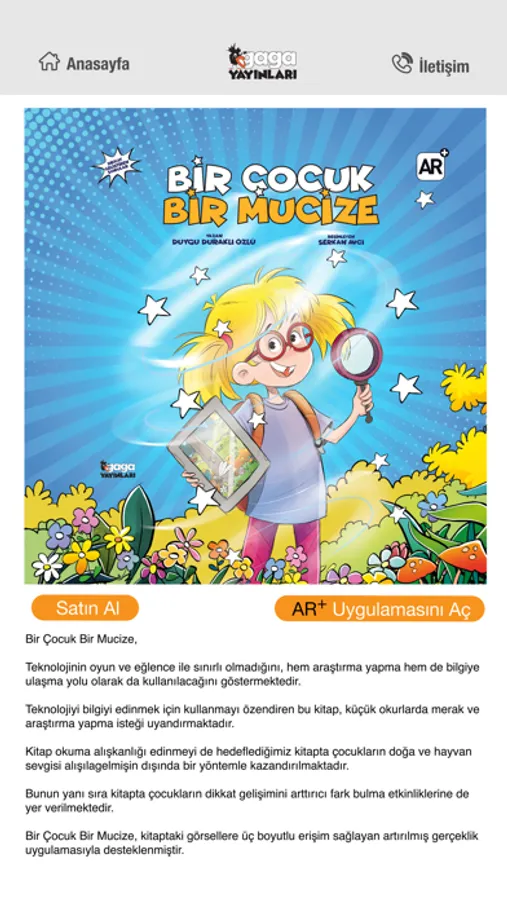 In order to use the AR books "Bir Çocuk Bir Mucize” and “One Child One Miracle" you need to purchase the hardcopy of the book first. When you buy the book from "www.gagayayinlari.com", you can start using your app. In the free app "Gaga Yayınları" you will see the guidelines how to use it. If you like to skip the instructions, you can press