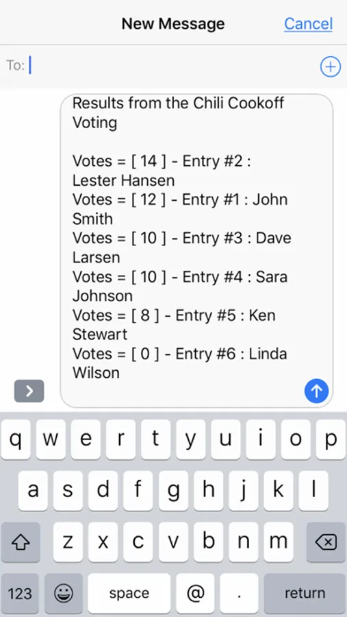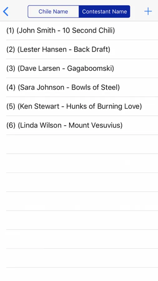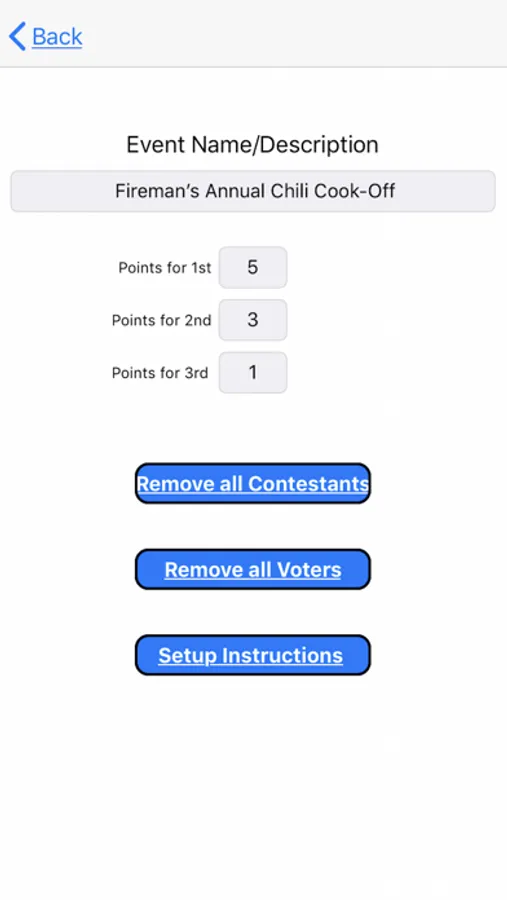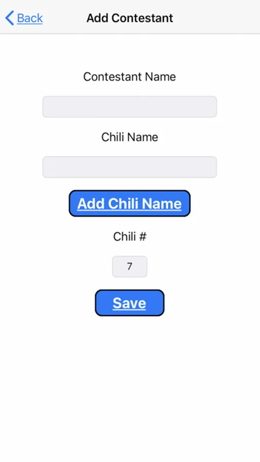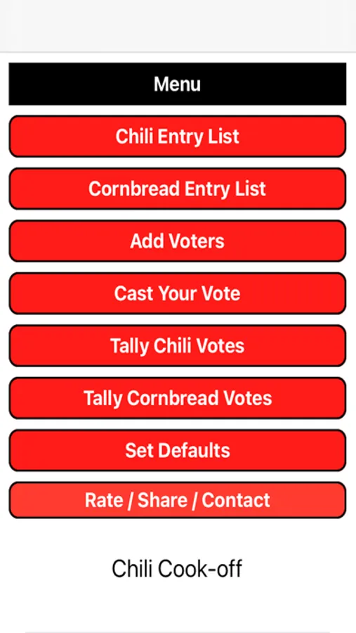 In the app, you can set up scoring points for 1st place, 2nd place, and 3rd place in the defaults screen. A typical score setup might be 7 points for first place, 4 points for second place, and 1 point for third place. You can also name the chili and cornbread contestants using the dozens of names provided or by adding your own.