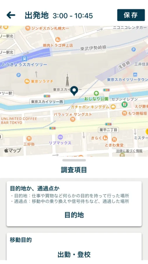 移動の記録は調査日の午前3時から開始します。調査日の前日にはアプリを起動させてください。