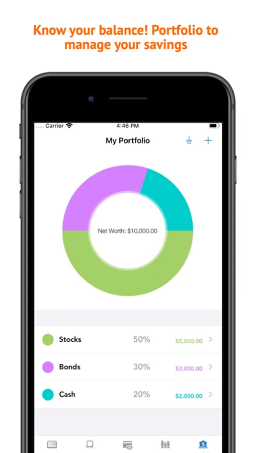 - How much of your cash is in stock, bond or cash? Portfolio tab helps you log your portfolio break down and also your liabilities!