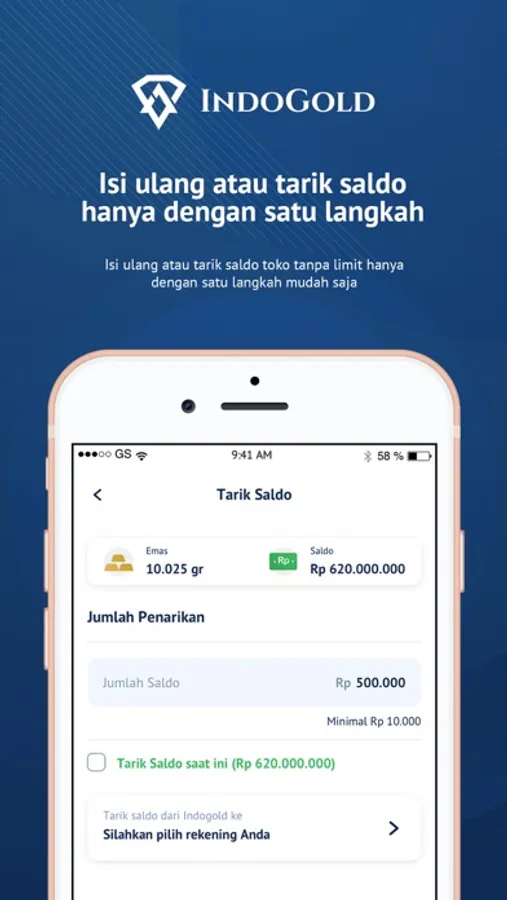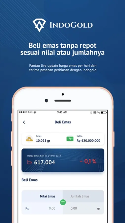 Dengan menggunakan aplikasi Mitra IndoGold, kamu akan memiliki akun penyimpanan pribadi untuk logam mulia. PT Indogold Solusi Gadai menyediakan layanan akun penyimpanan untuk logam mulia, harga terbaru setiap harinya, dan membeli serta menjual logam mulia bersertifikat dari PT Antam Tbk. Ayo menabung emas mulai dari 0.001 gram.