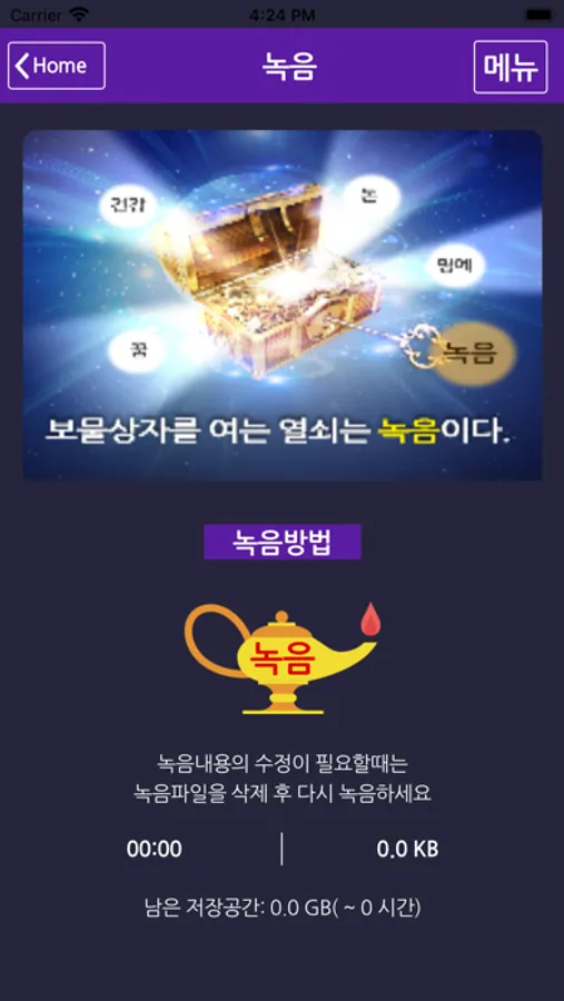 2. 선택된 녹음 파일들은 365일 24시간 동시에 재생할 수 있으며, 녹음 재생은 반드시 무음으로 하여야 녹음 효과를 극대화 할 수 있다. 녹음 재생시 소리가 들리게 되면 어느 순간 뇌는 잡음으로 인식하여 잠재의식에 부정적인 영향을 미치게 되어 녹음 내용을 성취할 수 없게 된다. (말)