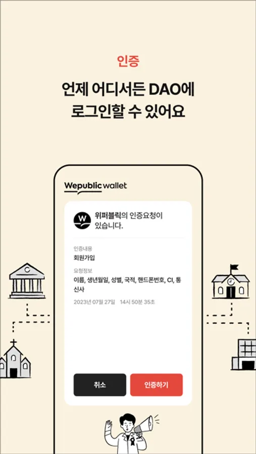 - 언제 어디서든 간편하게 Wepublic Wallet 하나로 DAO에 로그인할 수 있습니다.