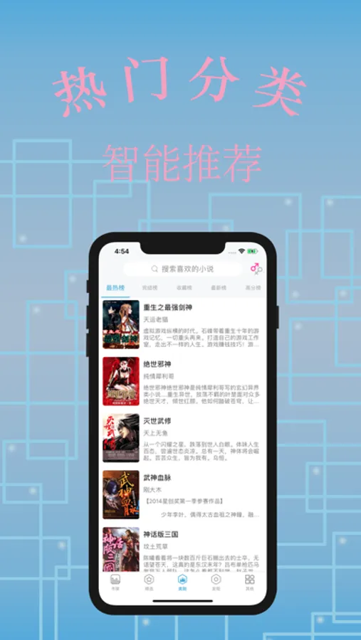 4、【分类】集思广益,言情小说、玄幻小说、穿越小说、都市小说,轻小说,武侠小说,军事小说,校园小说等等几十个分类,我们就怕爱看小说的你们找不到更精彩的书。点击查看分类,免费小说全本阅读呈现好看又有趣的潮流电子书APP。