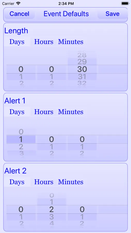 Calendar Counter lets you preset the default period of your event and the period for the first and second alert if you wish.