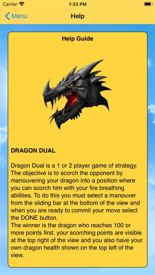 The objective is to scorch the opponent by manoeuvring your dragon into a position where you can scorch him with your fire breathing abilities. There are 25 different manoeuvres to choose from to outwit your opponent.The winner is the dragon who reaches 100 or more points first, or you lose sight of each other and end up lost and ready to battle another day.