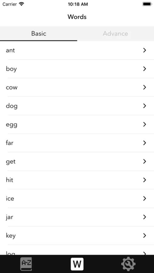 It provides not only letter by letter but 200 words, which show the users how individual(lower and upper case) letters are combined into words.