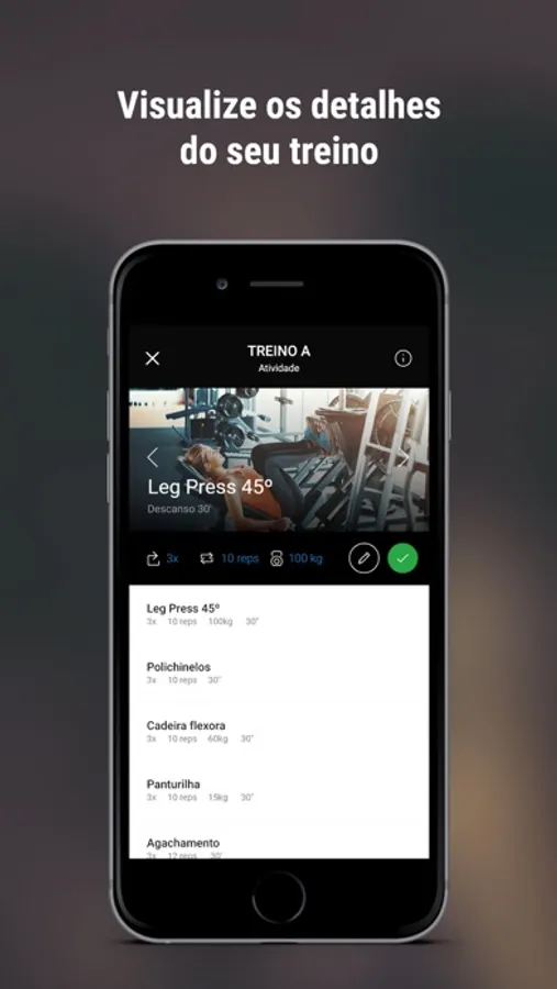- TREINO: informações sobre os exercícios, cargas, repetições, dicas de execução e vencimento do treino;