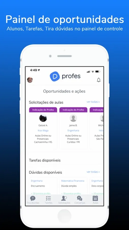 É muito fácil. Basta procurar pela disciplina ou especialidade e conversar com os professores cujo perfil você mais gostou. Gostaria que o Profes indicasse os melhores professores? Sem problemas, basta deixar sua solicitação de aula aberta e pública e até 7 excelentes professores entrarão em contato com você na ferramenta de conversas do Profes.