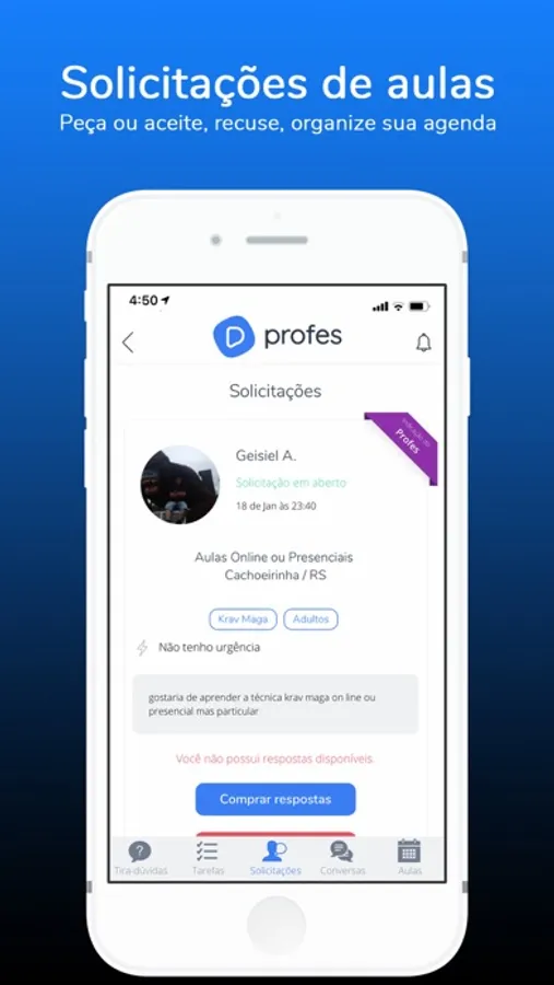 Uma vez escolhido, você decide tudo com o professor: data, hora, preço final e local, isto é, aula presencial no local que decidiram ou online na Sala Profes.