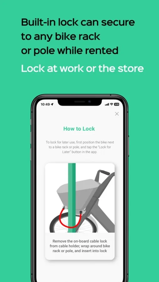3. Ride - The bike’s electric drive system will make pedaling effortless as you glide past traffic to work or the store. When you arrive, use the built-in cable lock to secure the bike to a rack or pole. It will remain rented until you’re ready to head back (or to your next destination).