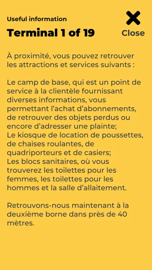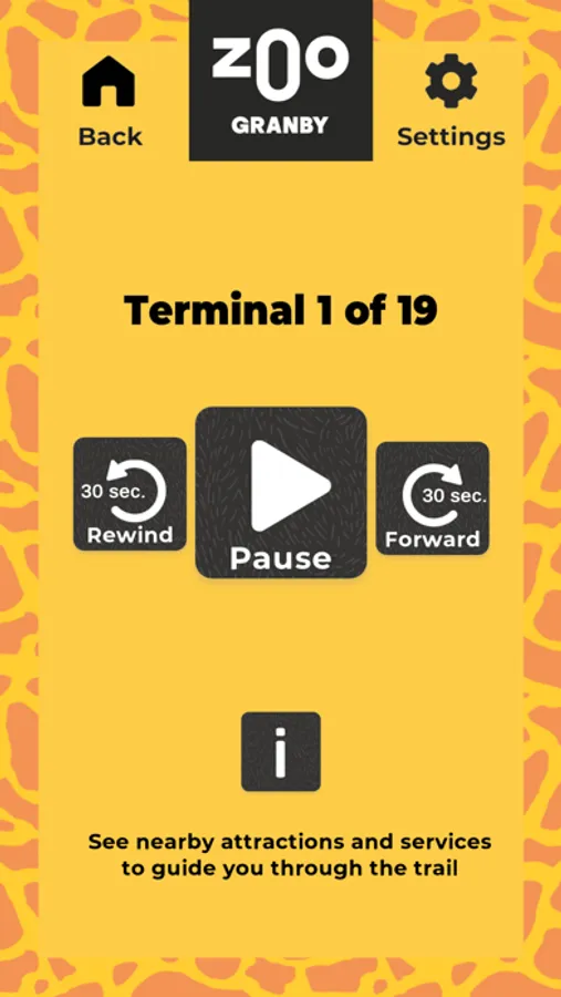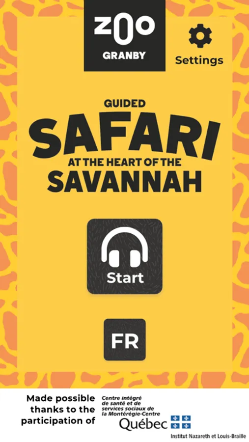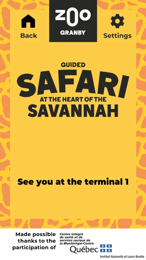 The application gives access to a commented tour of the Zoo de Granby’s Africa Trails Circuit and starts at the site’s entrance arch. A total of 19 terminals will be activated automatically by geo-localization when a user passes in the zone where the virtual terminal is located. The terminals are placed at an average distance of 40 meters one from the other. To optimize the experience, users must keep their left in order not to miss any information. There is an audio menu available to indicate attractions and services users can find in the vicinity of each terminal as well.