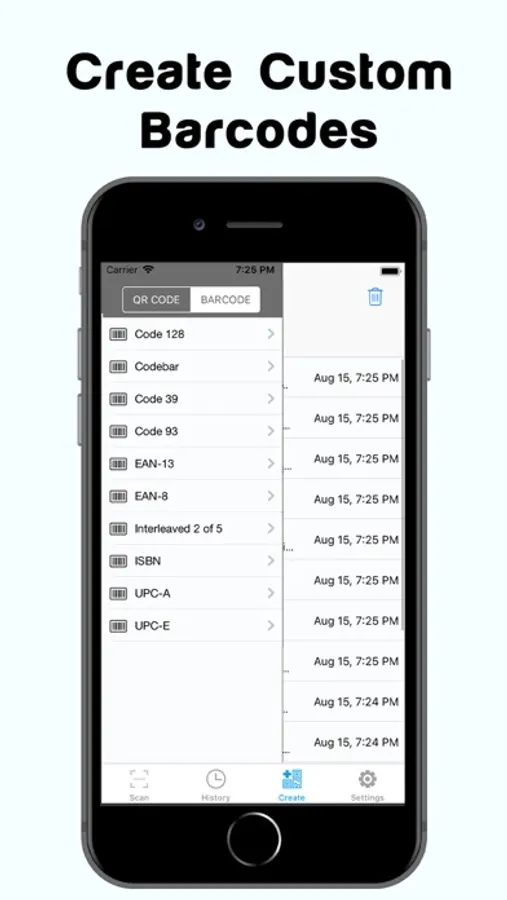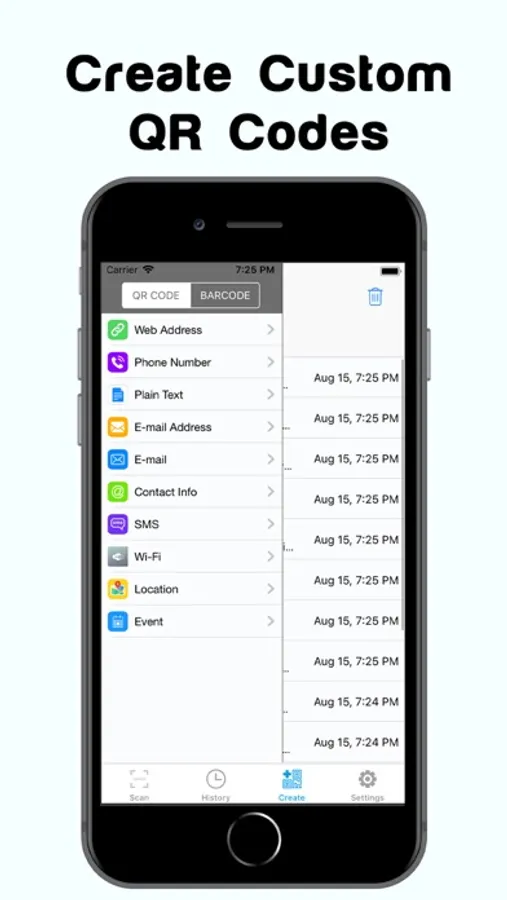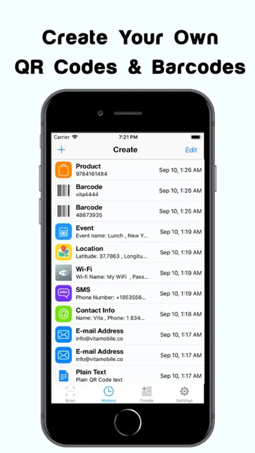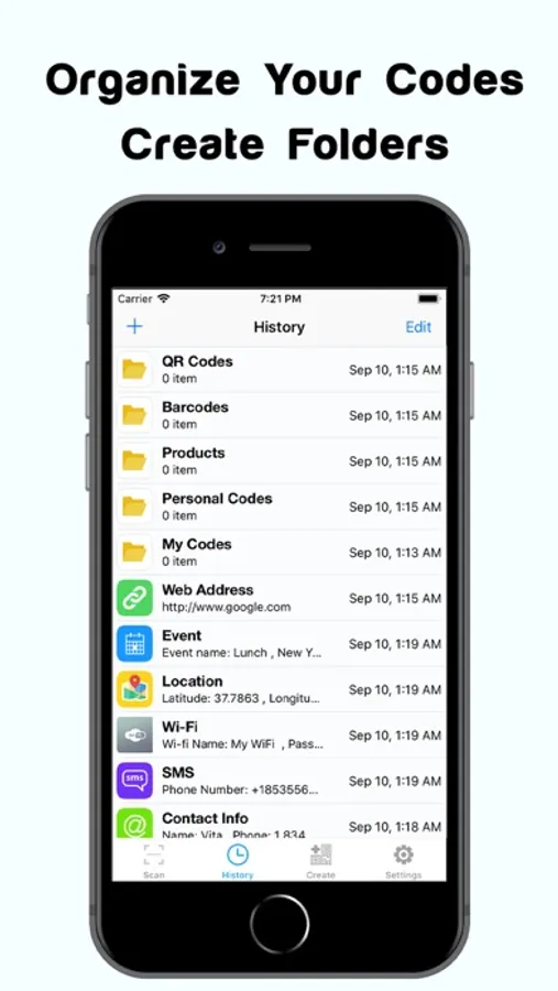Generate and share all types of QR codes and barcodes. Save your scanned codes in folders to organize them.