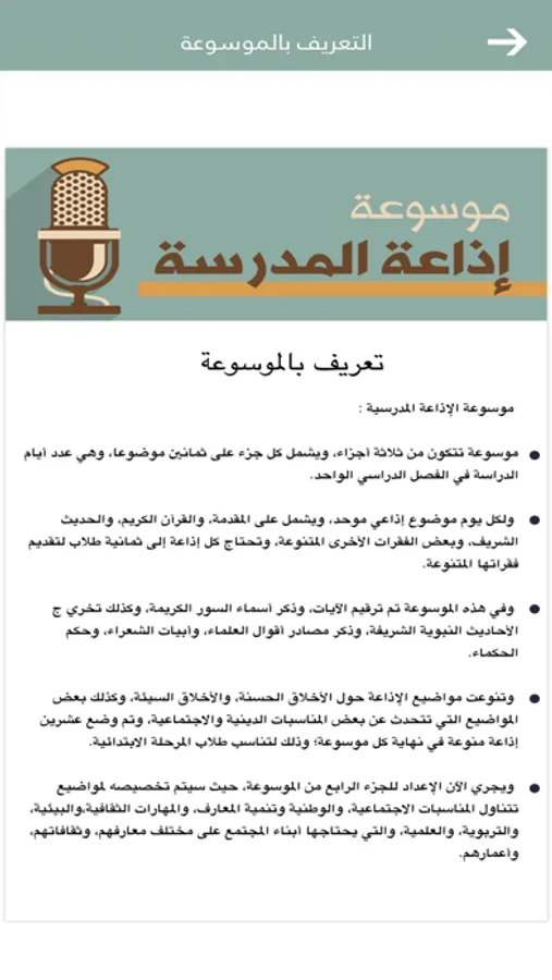 - وتنوعت مواضيع الإذاعة حول الأخلاق الحسنة، والأخلاق السيئة، وكذلك بعض المواضيع التي تتحدث عن بعض المناسبات الدينية والاجتماعية، وتم وضع عشرين إذاعة منوعة في نهاية كل موسوعة؛ وذلك لتناسب طلاب المرحلة الابتدائية.