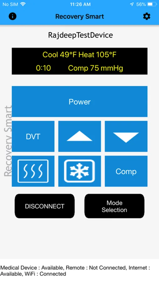 This application allows user to set serial # of recovery medical device so it can be identify uniquely on server. It provides bluetooth communication with medical device to operate all commands provided by hard wire remote control come with unit. It also retrieved usage of machine and upload to cloud after each therapy is completed by user.
