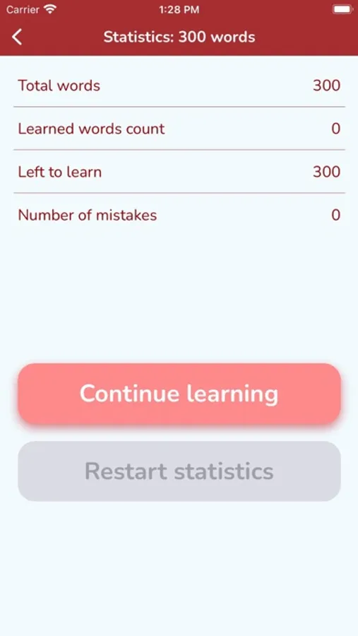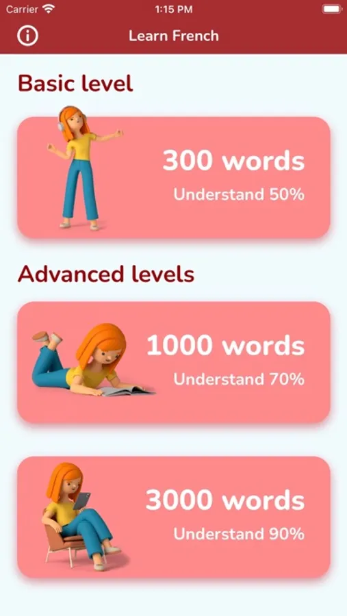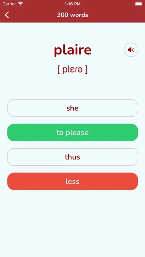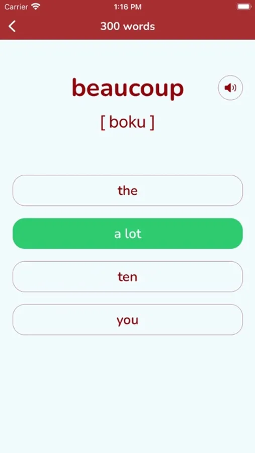 In app 4000 popular words of the French language. Continuing in learning is 20 words. As one word was 5 times continuously responded correctly, the word is sent to the learned and a new word is added from the base. Thus, the application allows you to train high-quality words