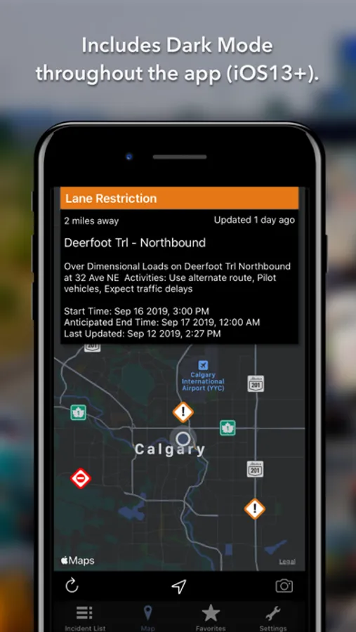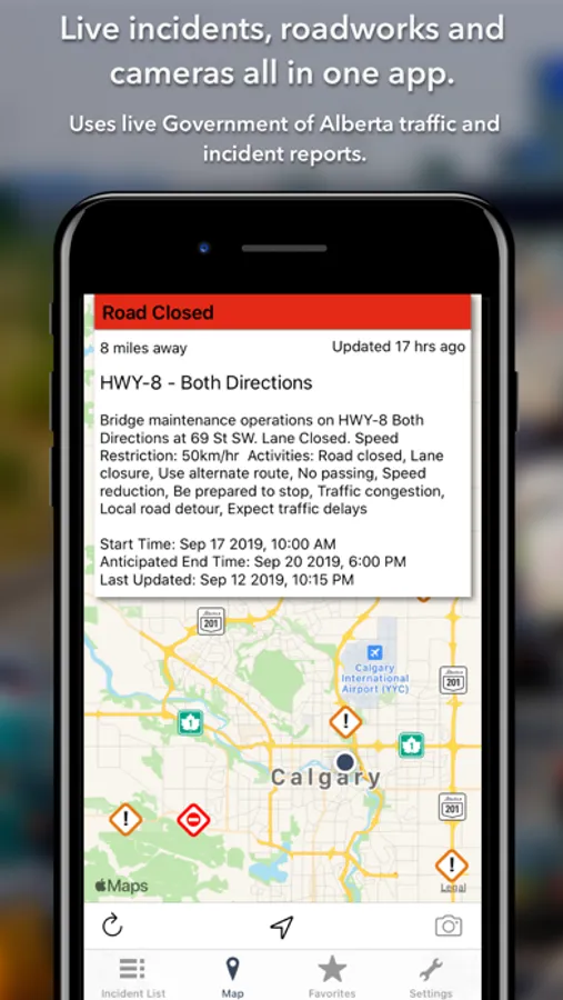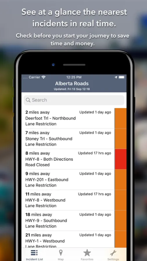 - Shows current incidents in order of distance from your current location (closest incidents are shown first).