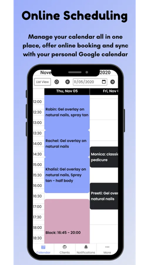 No jumping between Instagram DMs, text messages, emails and phone calls. Manage your calendar on iluk PRO and have your clients book appointments themselves according to your own availability.