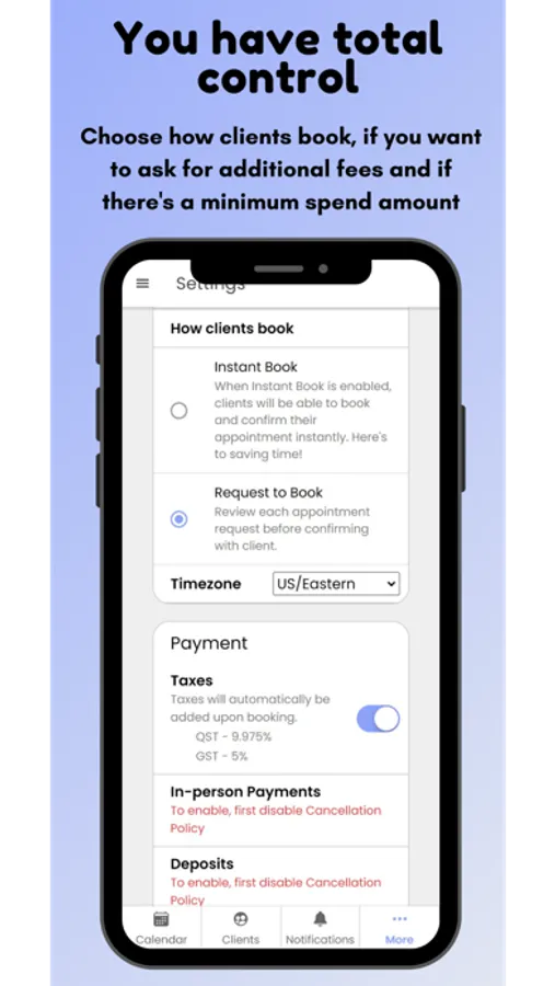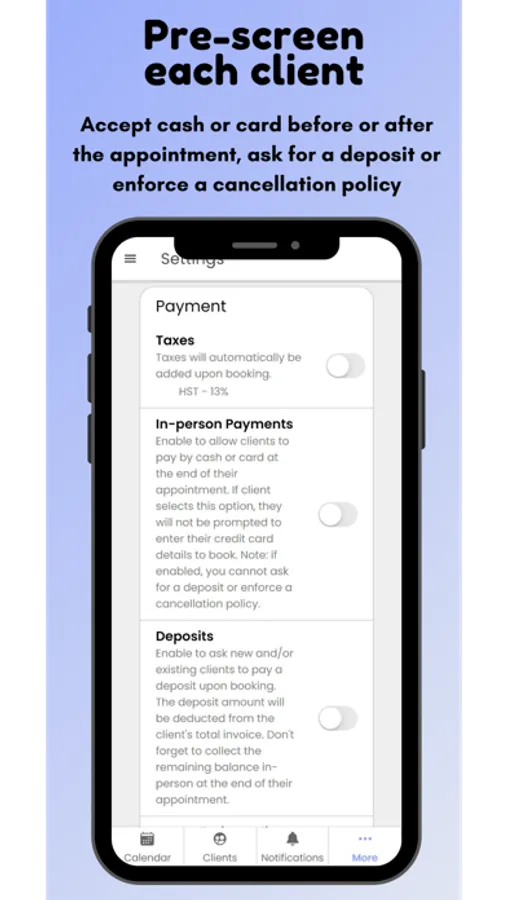 • Eliminate no-shows and last-minute cancellations with deposits and cancellation policies