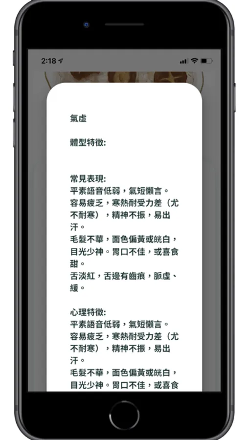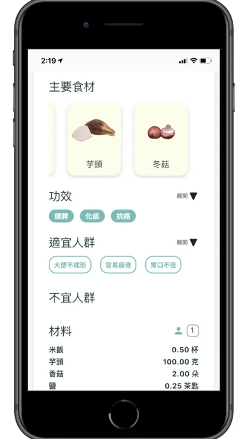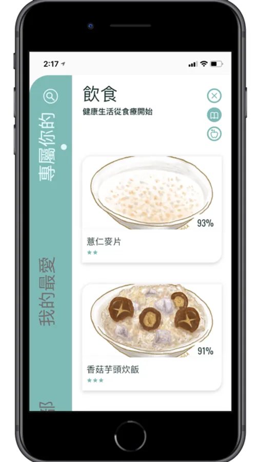 這個健康管理手機應用程式透過將體質與食譜配對以提供客制化食療建議,同時亦提供食材庫助用戶了解各食材的功用。用家需定期填寫體質問卷,從而獲得配合體質之定期更新食療建議。