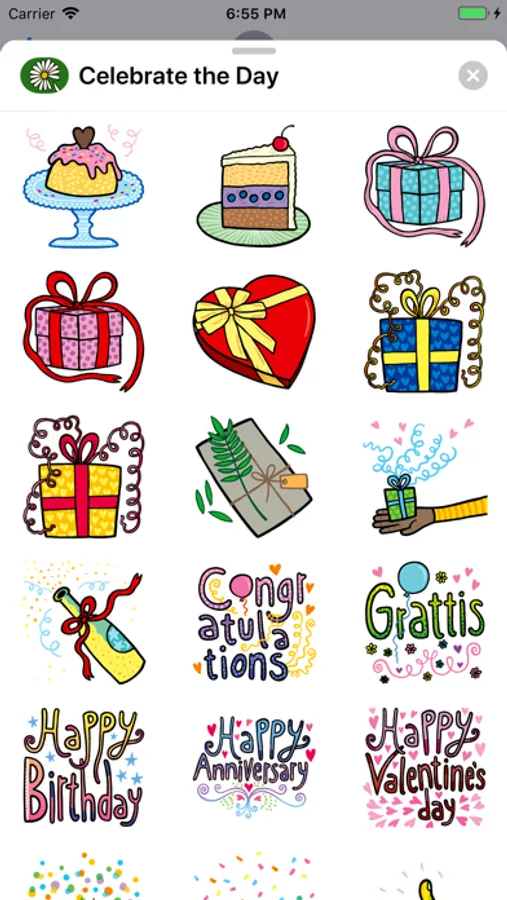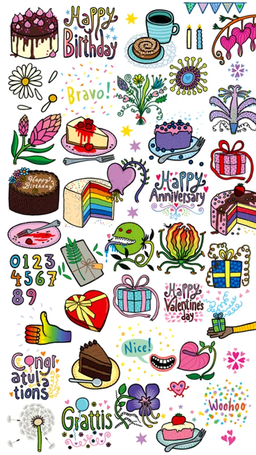 A colorful and cute sticker pack full of different ways to celebrate anything you can think of: anniversaries, Valentine’s day, and birthdays of course (both in English and Swedish) or just for something fun that needs a thumbs up and a “woohoo!”