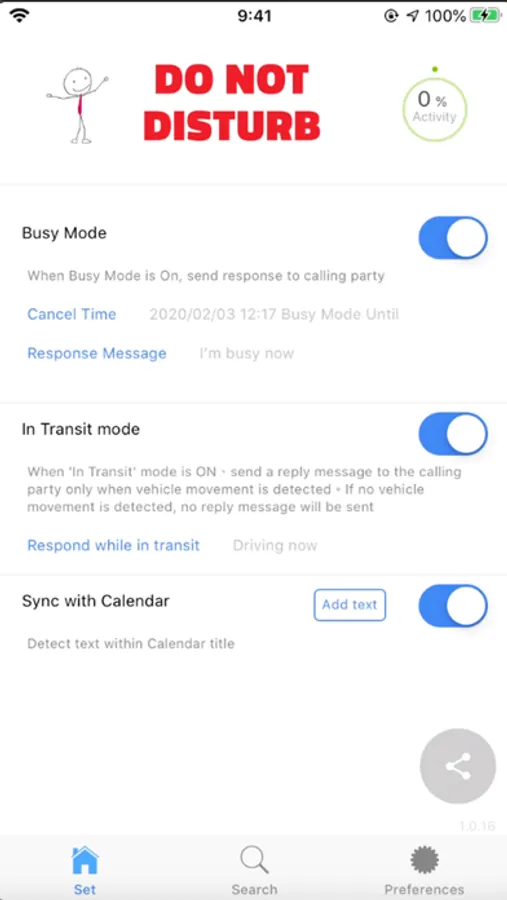 Set "Busy Mode" when you do not want to receive incoming calls. If you may not be able to receive calls while driving, set the mode to "Moving". Synchronize with the calendar, make settings, add text to the title of the event and notify at the needed time with "Calendar synchronization".