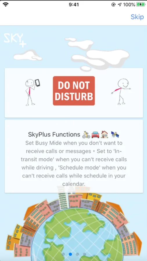 SkyPlus is an application that informs potential callers when you can’t receive calls due to being busy or your time management characteristics. If you do not want to receive calls now, while driving for example, or because you’re otherwise busy and/or unavailable, you can notify potential callers by using SkyPlus.