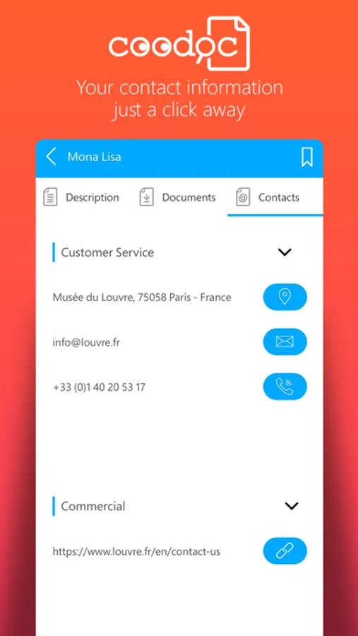 Coodoc application gives you direct access to the most up to date documentation about your target. It keeps and organizes your guides, user manuals, installation manuals, maintenance documents, package leaflets, catalogs, etc. It also provides you additional information about your products and helps you where to buy the product for a second purchase or where to find spare parts or repairers.