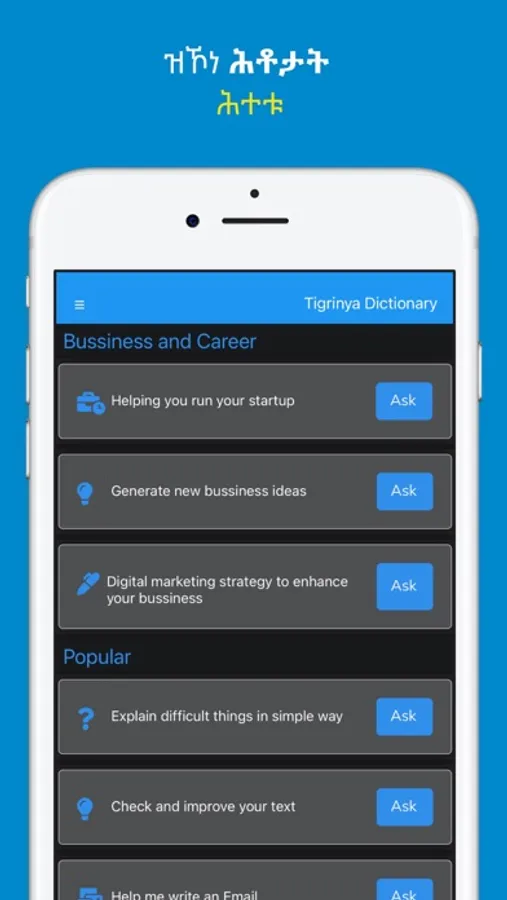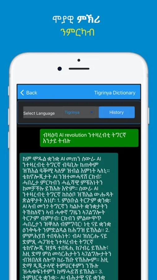 Tigrinya Dictionary app has now included the AI chat in Tigrinya where you will be able to get instant answers, professional input, tailored advice and learn new things.