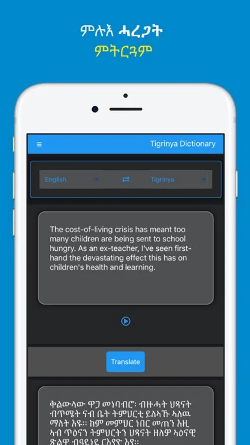 4: You can translate full sentences and define words between Tigrinya, English, Spanish, French, German, Italian, Swahili, Arabic and Amharic.