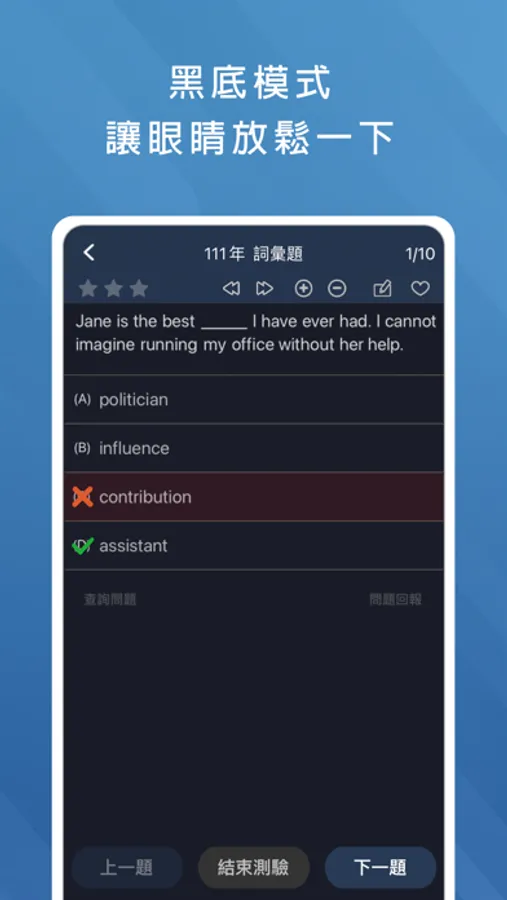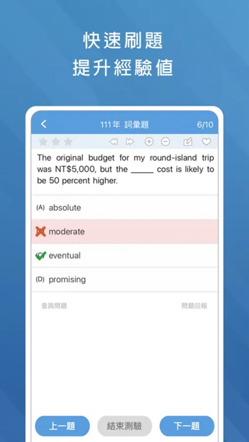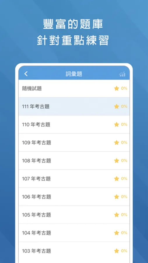 目前收錄的題目有學測、指考、統測、二技、國中會考、高普考、導遊領隊人員考試,我們會再持續新增最新的題庫。