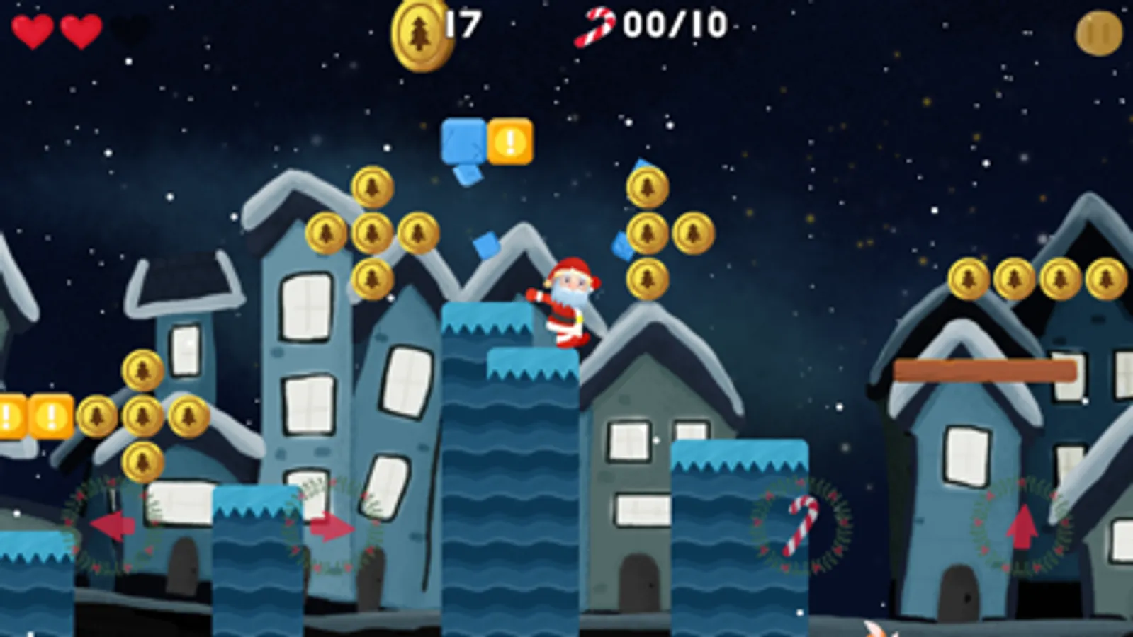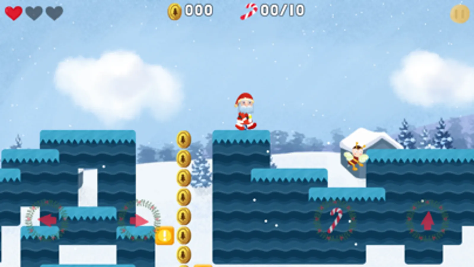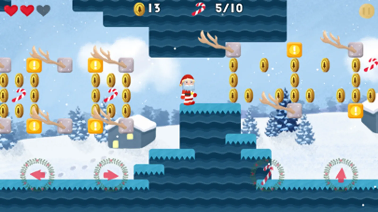 Santa's sleigh is smashed by a meteorite, and the presents for children are scattered to every corner of the earth. You need to control Santa to climb the mountain, through the caves in jungle, and defeat the monsters that block the road. Every time you pass a level, you will find a present piece. Each time you accumulate three pieces, you can restore an integrated giftbox and then get a toy. Each toy will be sent to children from different countries on Christmas Eve.