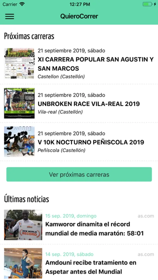 En QuieroCorrer te informaremos de las carreras populares, maratón, medio maratón y muchas otras pruebas en la provincia o provincias que tú elijas. También podrás consultar clasificaciones y estar informado/a de las últimas noticias del atletismo mundial.