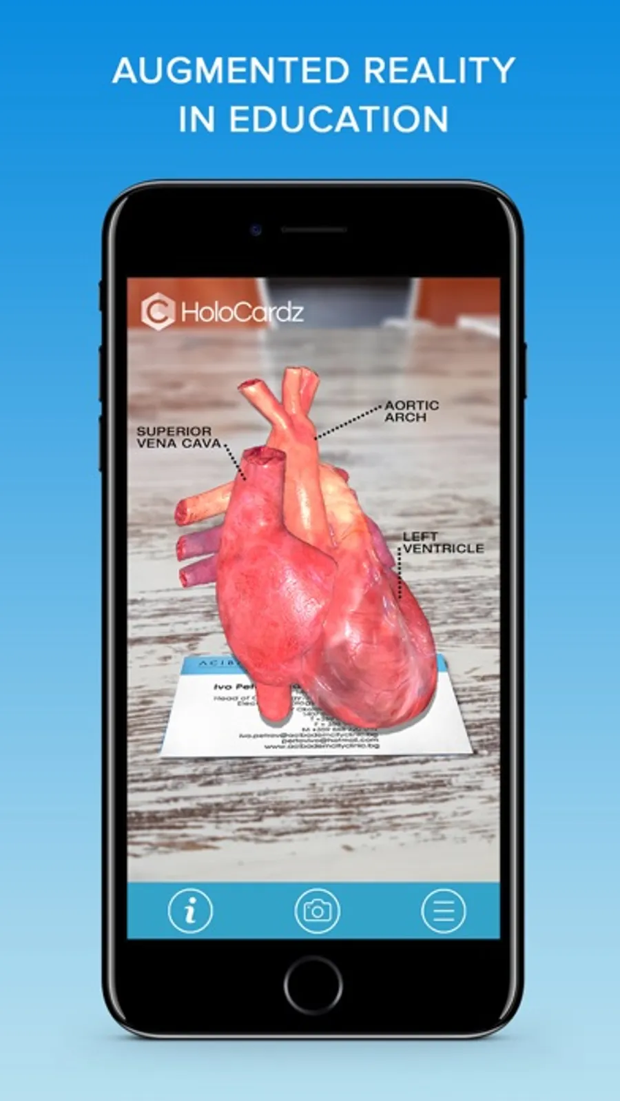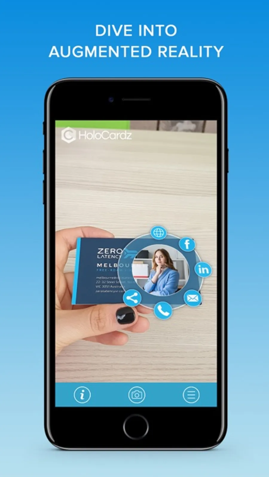 HoloCardz augmented reality app has interactive markers inside the app. By scanning them, you will be able to meet our company closer, interact with our animated characters, and find us online and in social media. Download, open and point your device camera at augmented reality enabled markers and see them come to life with interactive video or 3D content.