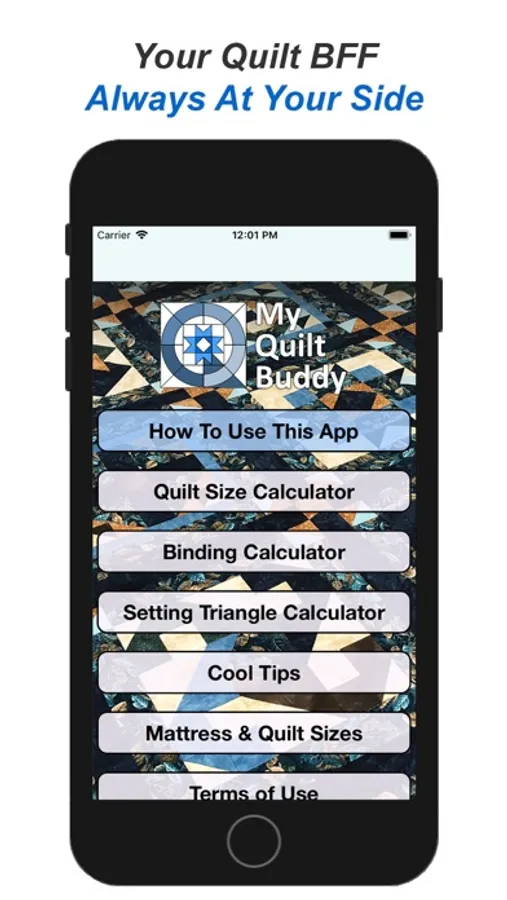 Having My Quilt Buddy on your iPhone allows you to have these reference tools wherever you go and sew - next to you by your sewing machine, with you at your next quilting class, at the local fabric shop, or sharing with your fellow quilters over lunch. Wherever and whenever you need access to quick calculations in your quilt designing process.